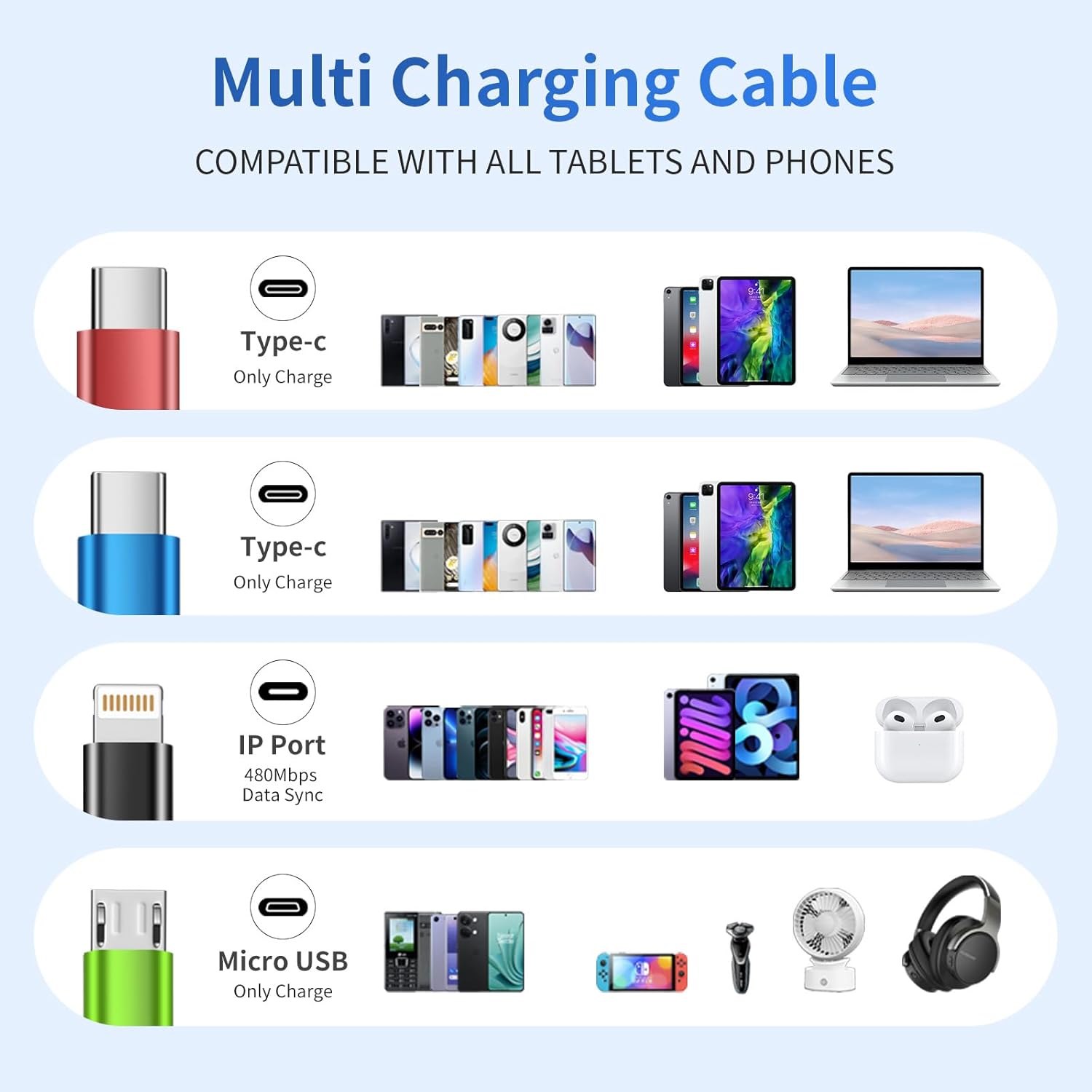 4 in 1 Multi Charging Cable [2Pack 5FT], Nylon Braided 4 in 1 Charging Cable, USB Cables Phone Charger with IP/Type C/Type C/Micro Port, Compatible with Most Cell Phones/Tablets and More